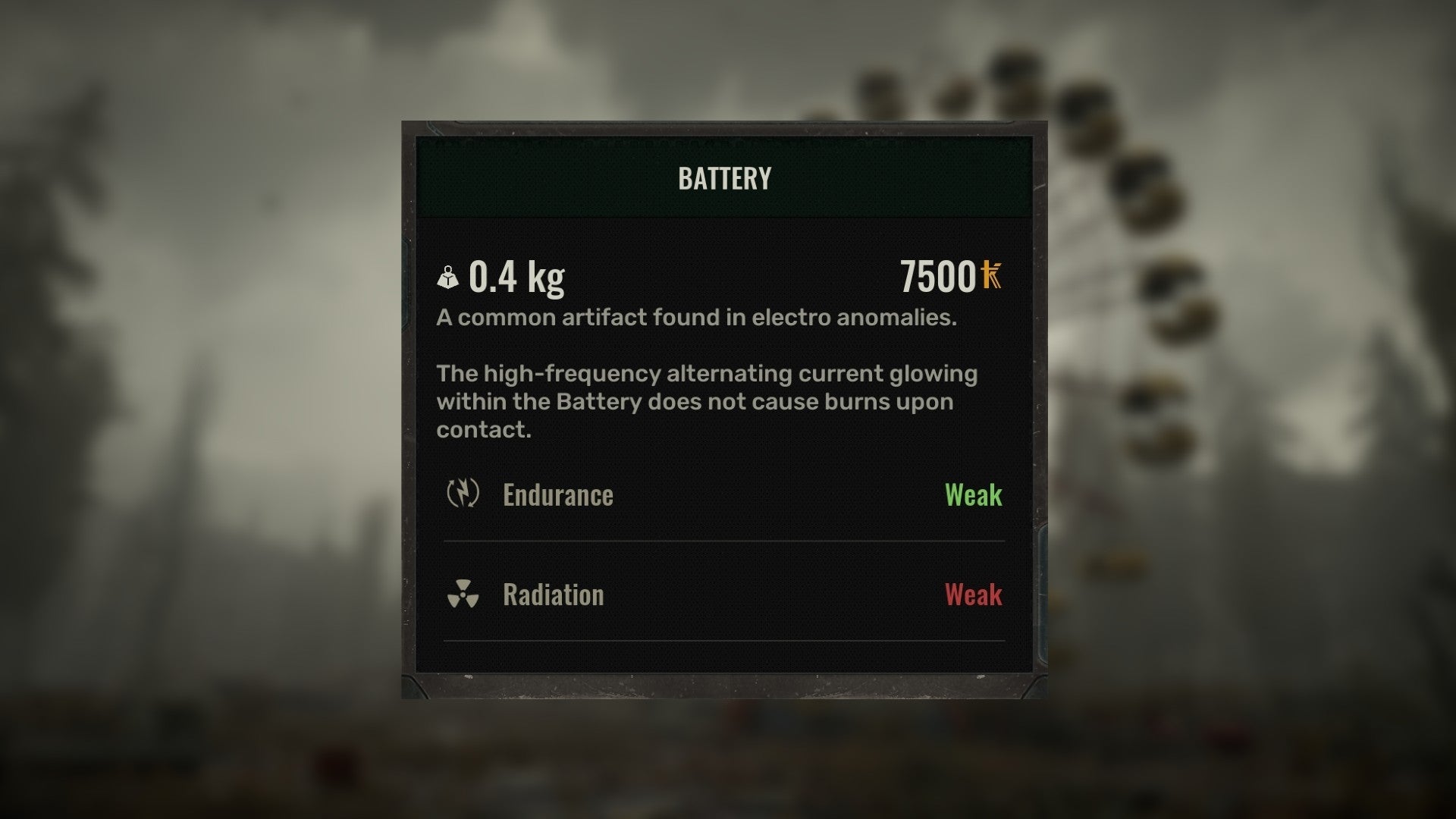 The Battery Artifact is found near radiation pool / bubble anomalies and provides the following: