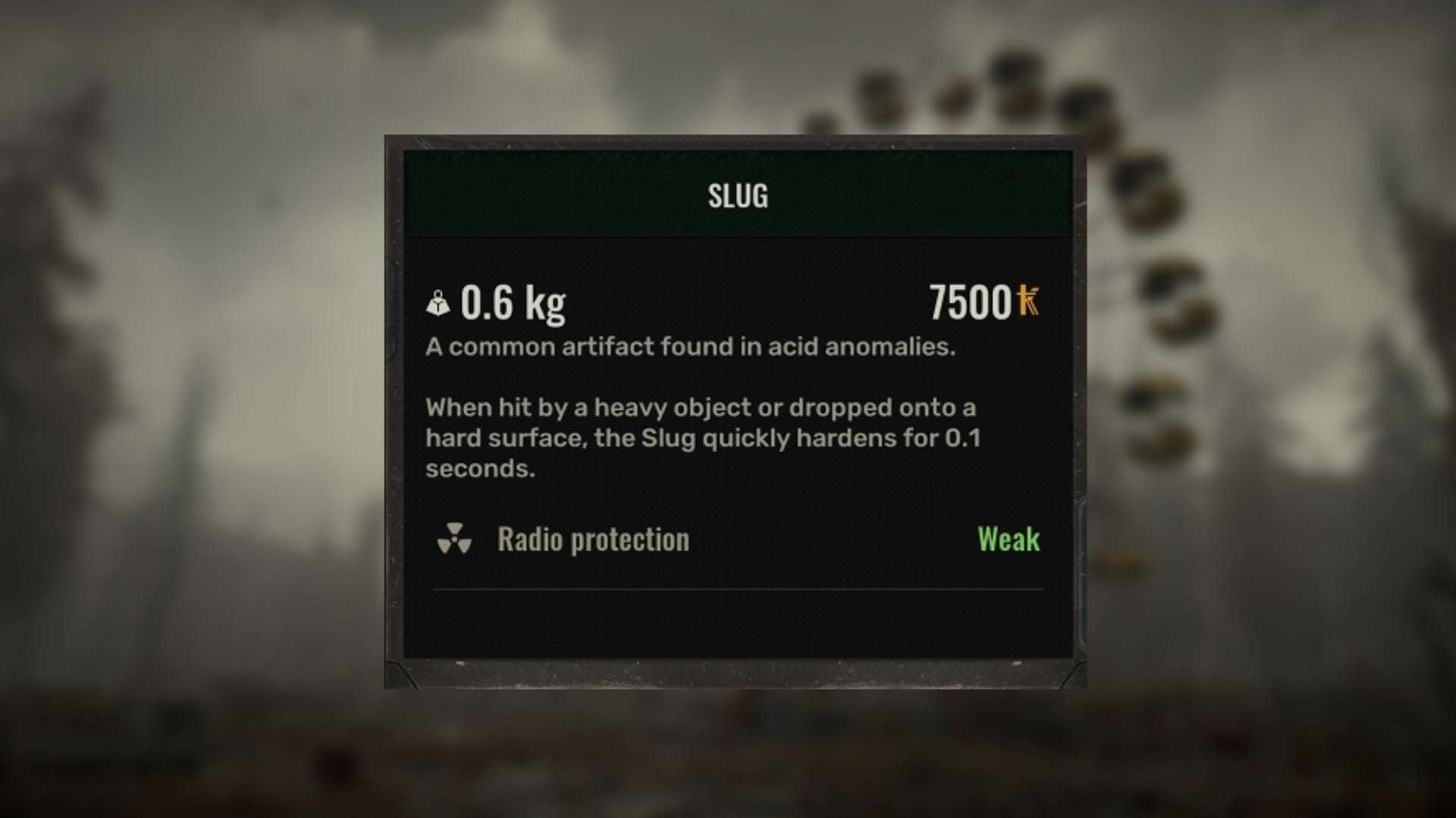 The Slug Artifact is found near radiation anomalies and provides the following:
