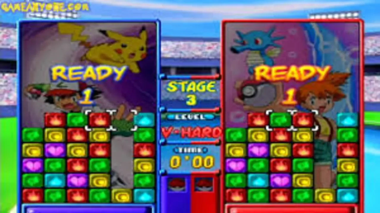 Pokemon Puzzle League plays out a little like a merge and match game, rather than any of the other Pokemon games you might be used to. It’s a Pokemon-themed version of Tetris Attack and Panel de Pon, where players must move matching blocks into columns or rows in an attempt to rack up as many points as possible before the blocks reach the top of the board.