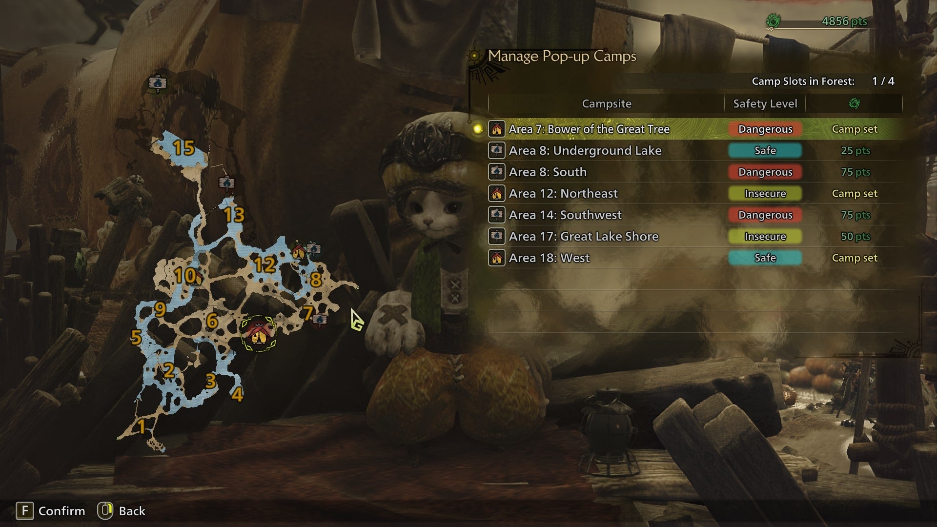 Pop-Up Camps cost Guild Points to construct, and can be built in areas of varying threat levels. Camps built in Dangerous areas are likely to be attacked by large monsters. These tend to repair themselves slowly over time, but you can visit the Pop-Up Camp Meowster at Base Camp (or beside a destroyed camp) to pay Guild Points to have it repaired.