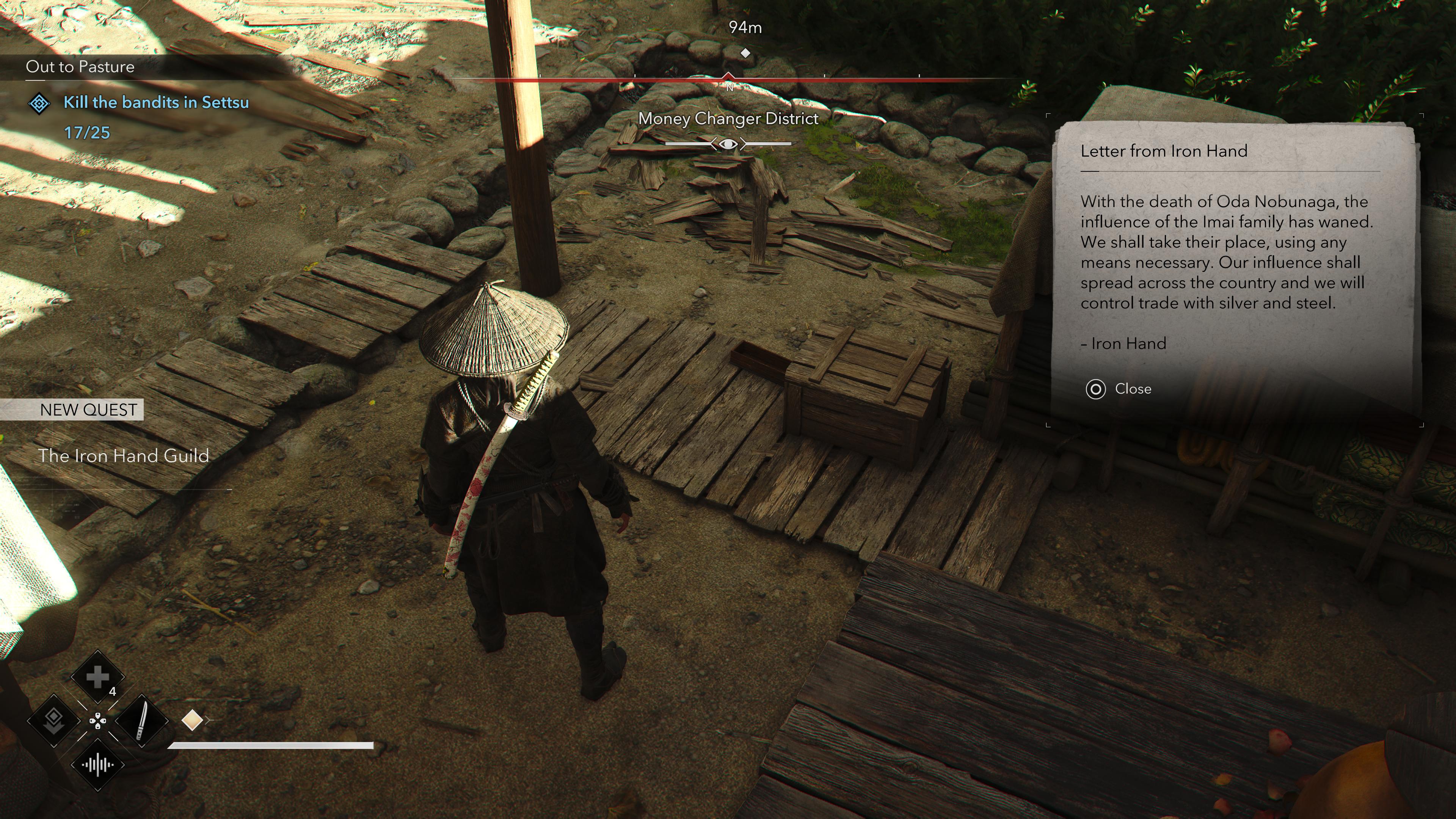 When she finds an incriminating letter in the Money Changer District (or any other bandit-controlled hostile area in Settsu), it seems as if the Imais are trying to step into the void left by Nobunaga under the guise of the Iron Hand.