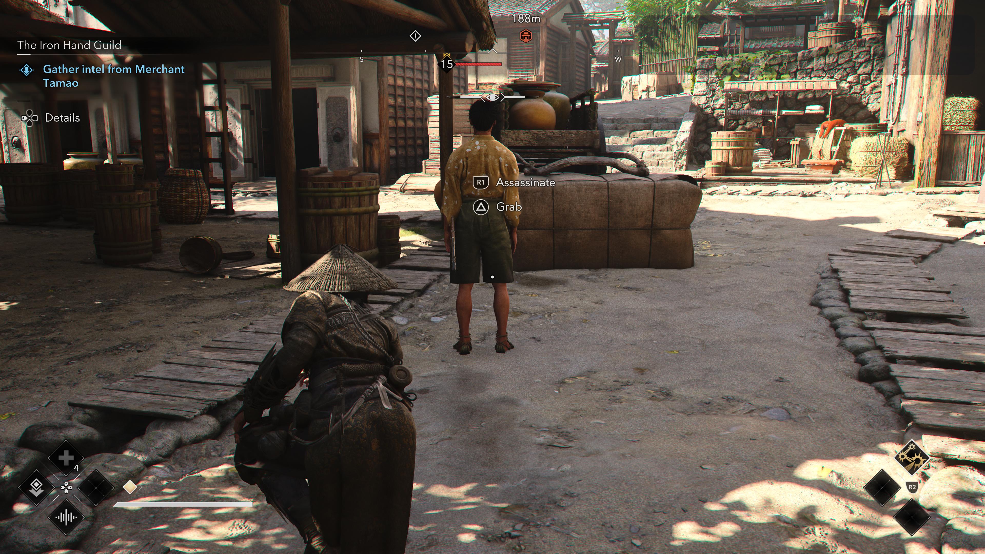 To lure him out, Naoe suggests destroying some of his stock. The shining blue markers all around the yard indicate the stock to destroy. Crash around in the barrels and he’ll burst out, katana in hand.