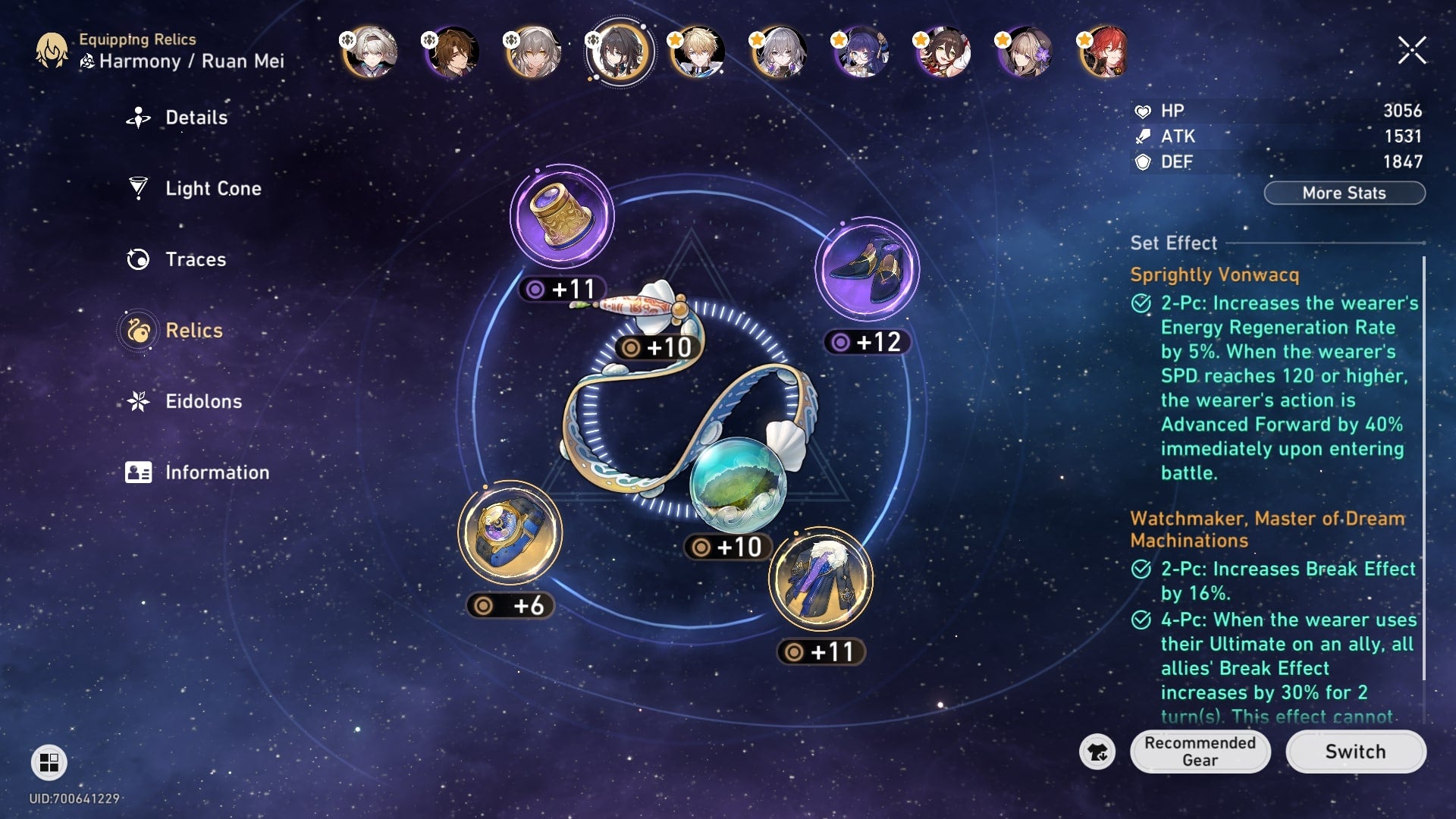 The best set of Relics for Ruan Mei are Watchmaker, Master of Dream Machinations, which provide the following stats when equipped: