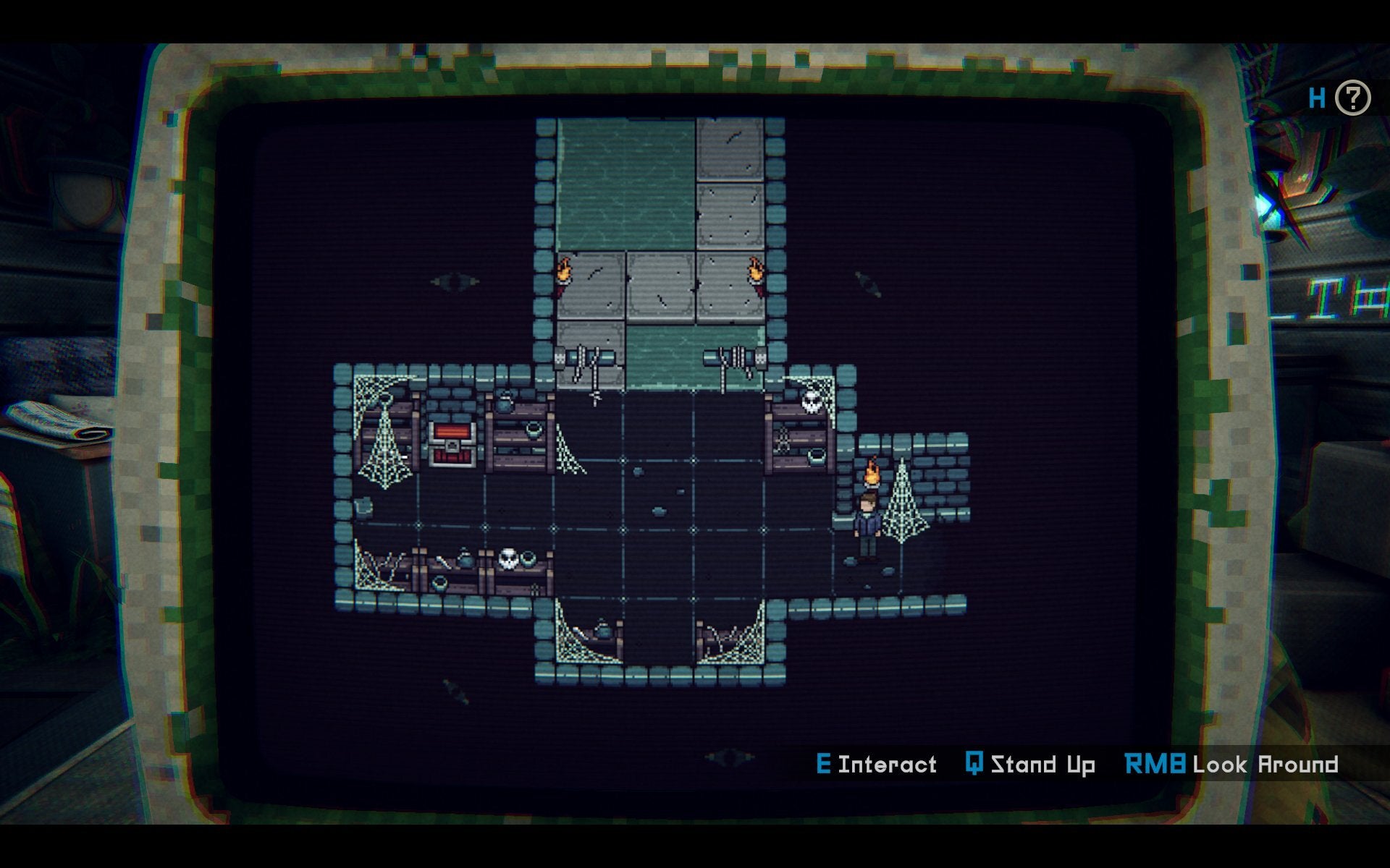 Spoiling the whole demo would defeat the purpose of me trying to convince you to play it yourself, but the concept is a neat one: you find yourself in a cabin, there’s a skeleton on a bed, an odd clock in the corner, some bizarre items around the place, and a prompt asking you to interact with a computer that’s sat in the middle of the room – a computer that offers up a retro-styled dungeon adventure game. After a bit of poking around a gameshow host of sorts (imagine Bradley Walsh from Gladiators, but he’s a ghoul) gives you the lowdown of what’s going on and you start your adventure, both on the computer and also in the room itself.