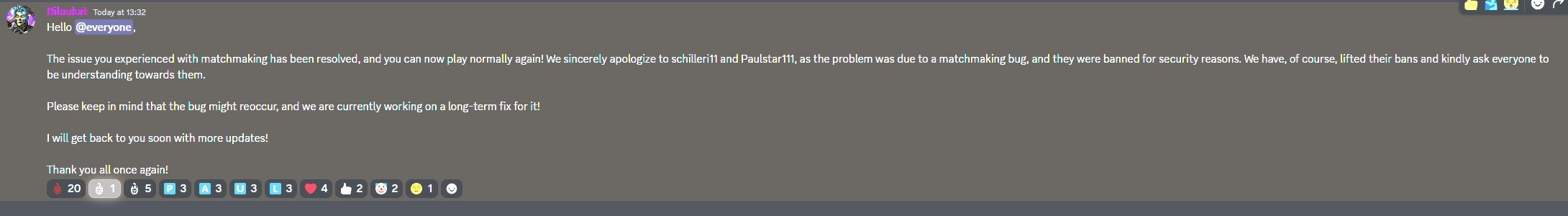“We sincerely apologize to schilleri11 and Paulstar111, as the problem was due to a matchmaking bug, and they were banned for security reasons,” they continued, “We have, of course, lifted their bans and kindly ask everyone to be understanding towards them. Please keep in mind that the bug might reoccur, and we are currently working on a long-term fix for it! I will get back to you soon with more updates!”