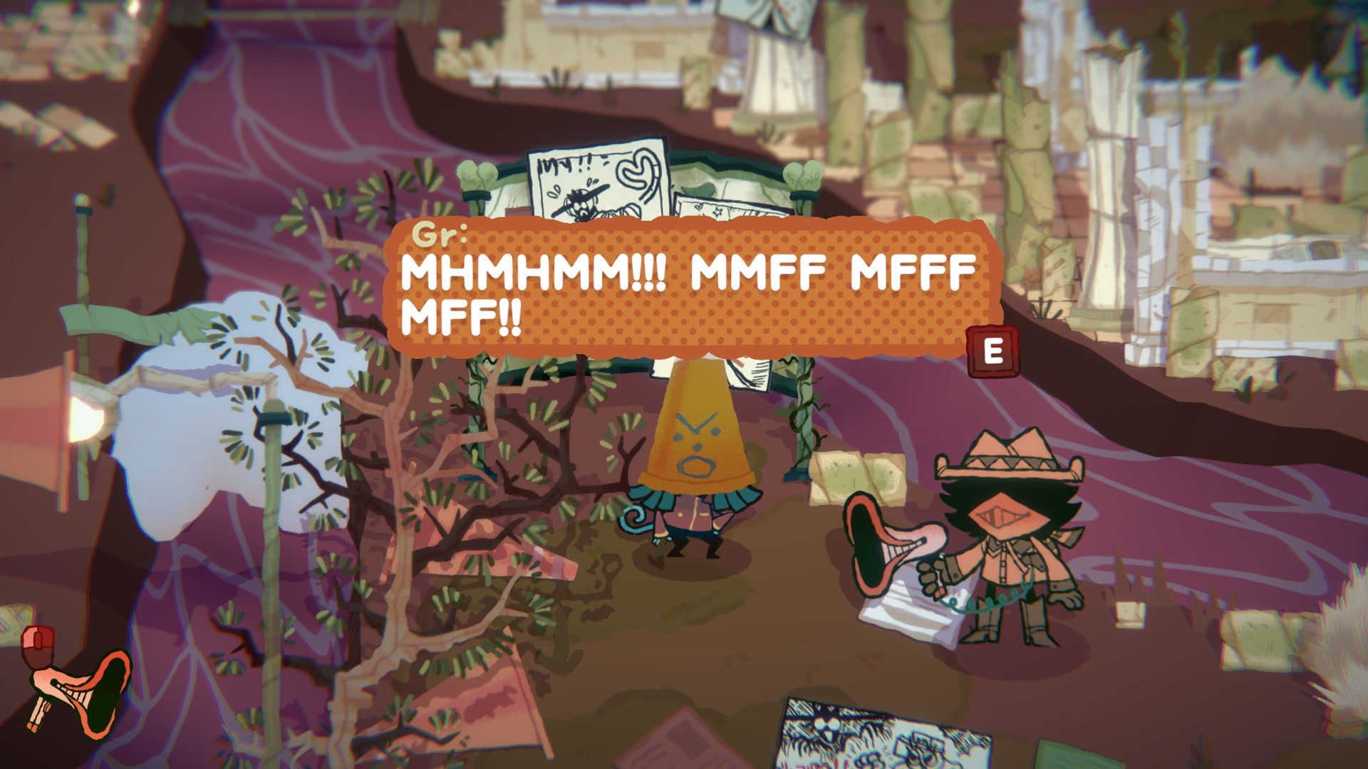 Not every speech snippet needs to be used strictly for a puzzle. You can fire dialogue at any character and it will almost always provoke a response and fun interaction. I once ran around the Grove firing ‘I’m HAM-HOT for a handsome god’ to everyone to see their reaction and was not disappointed. Puzzle solving isn’t just limited to hoovering up dialogue bubbles, you’ll be using your sucking power to pull levers and pick up items too. I even sucked up someone’s sneeze, which when fired would burst into a gross, germy cloud. There are also ‘combat’ sequences, but ‘combat’ feels way too serious for what is essentially launching pumpkins at a little guy wearing a traffic cone for a helmet.