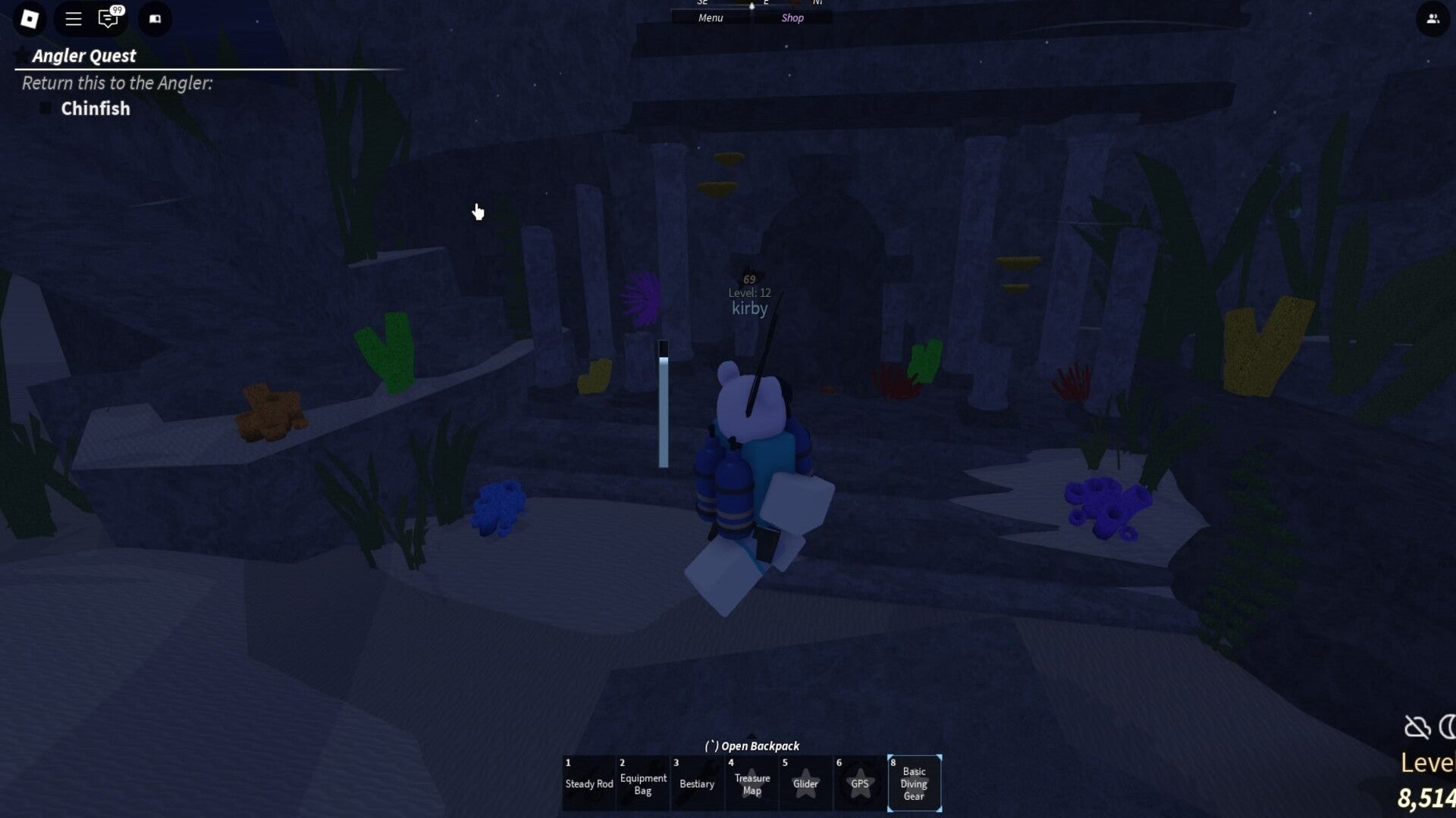 Make your way back to Fisch’s Grand Reef, and dive into the water below the Bubble Mermaid. Basic Diving Gear, which costs 3000 Credits, is more than sufficient for this bit of diving we need to do.