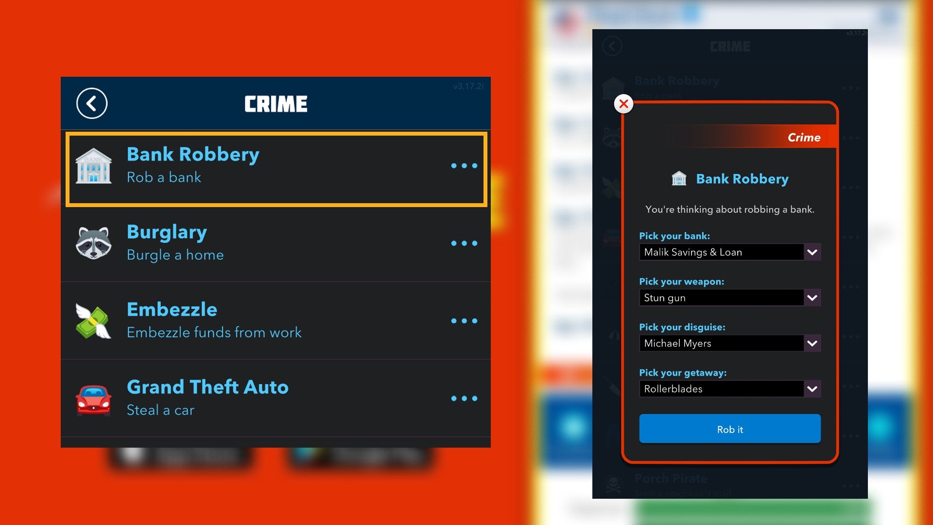 At 18, you can enter the ‘Activities’ tab and select ‘Crime’ to see a list of crimes you can commit. At the very top, you’ll see ‘Bank Robbery’.