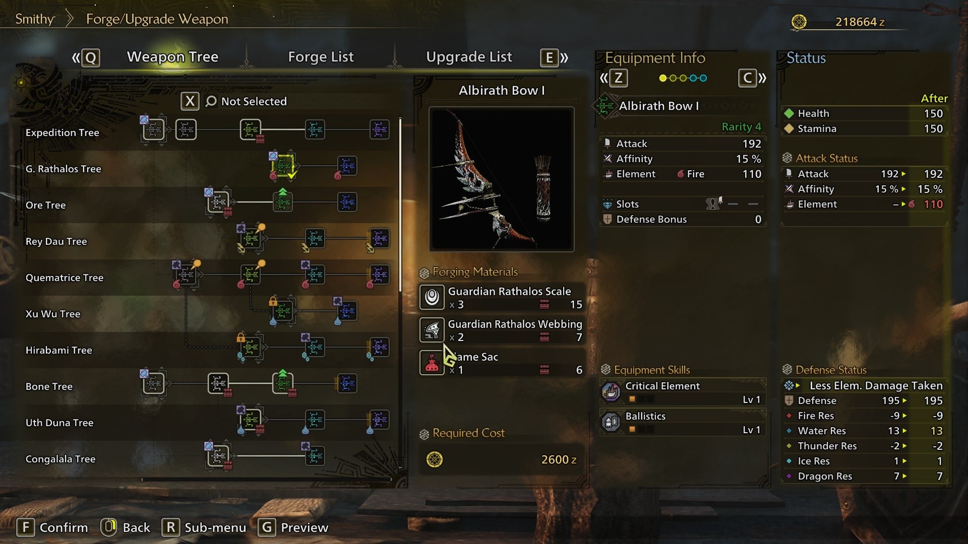 You’ll notice that some weapon trees tie to others, too. For example, looking at the above screenshot, players must forge the first Quematrice Bow to be able to access the Hirabami weapon tree. Similarly, they must forge the second Quematrice Bow to access the Xu Wu weapon tree and so forth.