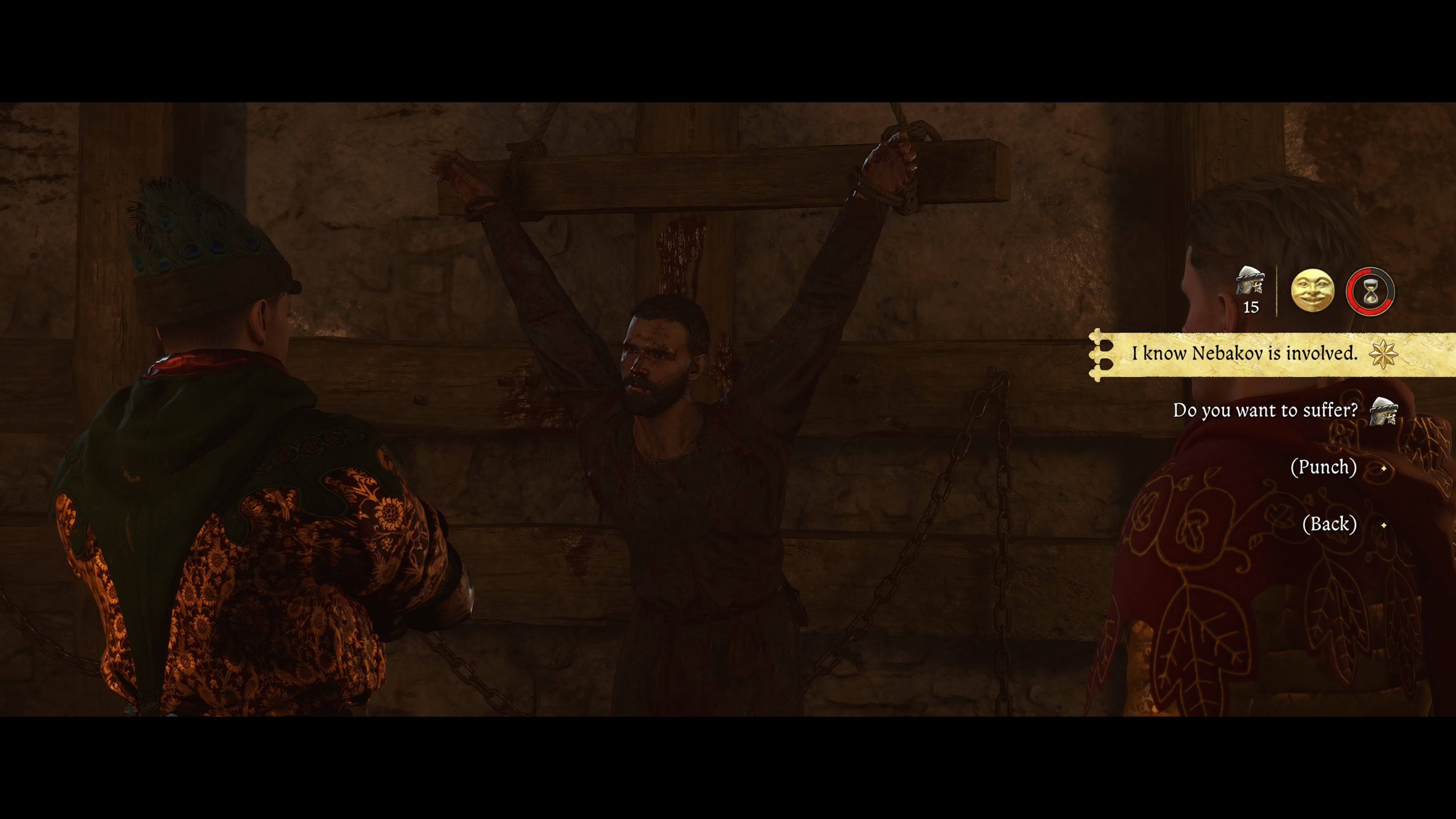 Finally, pick up Henry’s personal vendetta and ask about the man they call Istvan Toth. Here you can either go to the torture tools, or use your charisma and knowledge further. With 20 charisma, I managed to get him to speak about Toth. You get confirmation that he’s there with the bandits, but the man really doesn’t know anything about your swords, so you can drop it after that to avoid losing face with Hans.