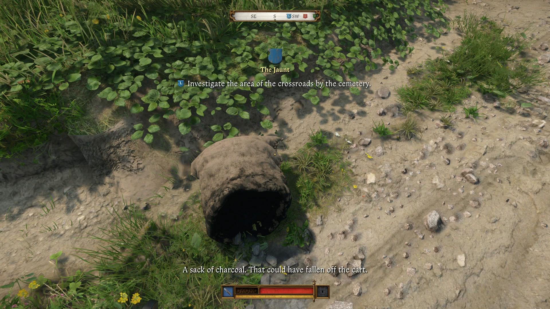 Henry is sent over to the left to search the cemetery. It’s worth considering that there’s a shovel you can pinch in the cemetery yard (shovels can be difficult to come across otherwise), but what you’re looking for is a small brown bag next to the road outside the cemetery wall. It’s a sack of charcoal that likely fell from the cart and now points the right direction.