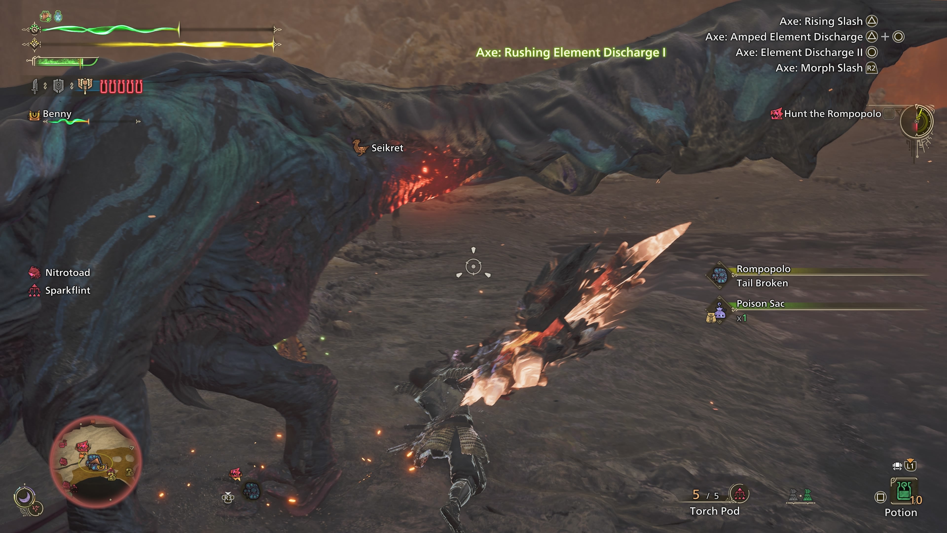 You can see how much elemental energy you have stored in the small pots, called phials, in the top-left corner of your screen. When the phials are all red, that means they’re full and your sword attacks will start to bounce off of monsters. This is your cue to press R2 + Circle to Charge and switch to axe blows. You can definitely just use the axe attacks without charging energy first if you want, it’s just not as explosive.