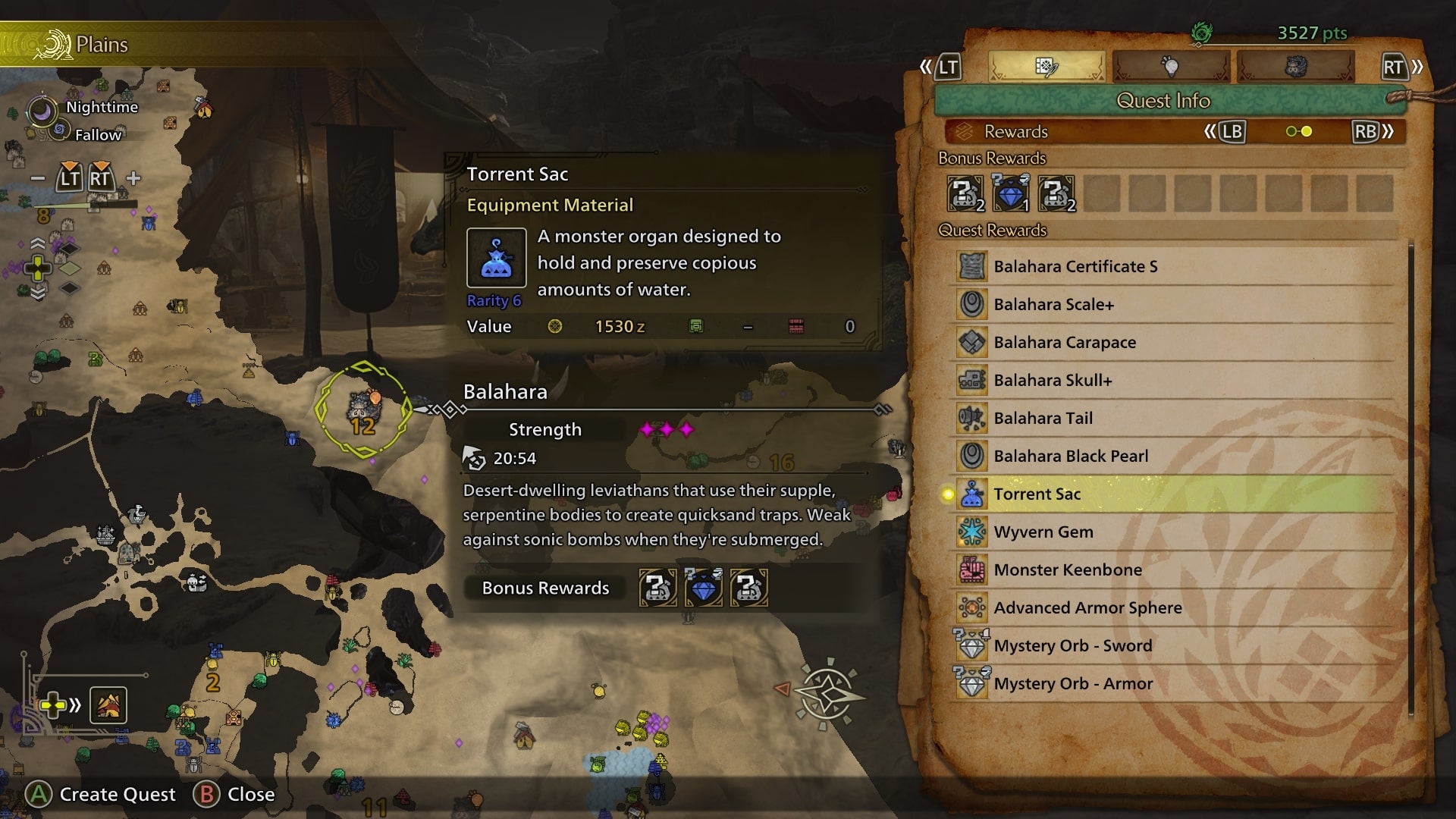 Before farming for Torrent Sacs, first take a look at your World Map and look at the Environmental Overview – on the right-hand side of your screen – for the Scarlet Forest and Windward Plains biomes. This will tell you which Large Monsters are available to hunt right now, so you can quickly get going.