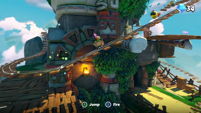 The first world, in particular – a tropical sprawl of ancient ruins and towering peaks – is a riot of imagination, bounding from checkpoint races to minecart challenges to combat encounters to timed agility challenges to platform puzzles, and more. Some older sections have been intelligently reworked and new diversions added – including oodles of coins to collect and spend on some very amusing cosmetic wearables – meaning there’s more to see and do on your travels, further improving that exploration flow. Sure, all this is ultimately in service of ticking yet another collectible off your list, but there’s enough invention that, early on at least, it doesn’t seem dull. And, yes, the daffy charm and spirited silliness, the gently ribald humour, has – despite the fluffier, less focused script – survived the overhaul.