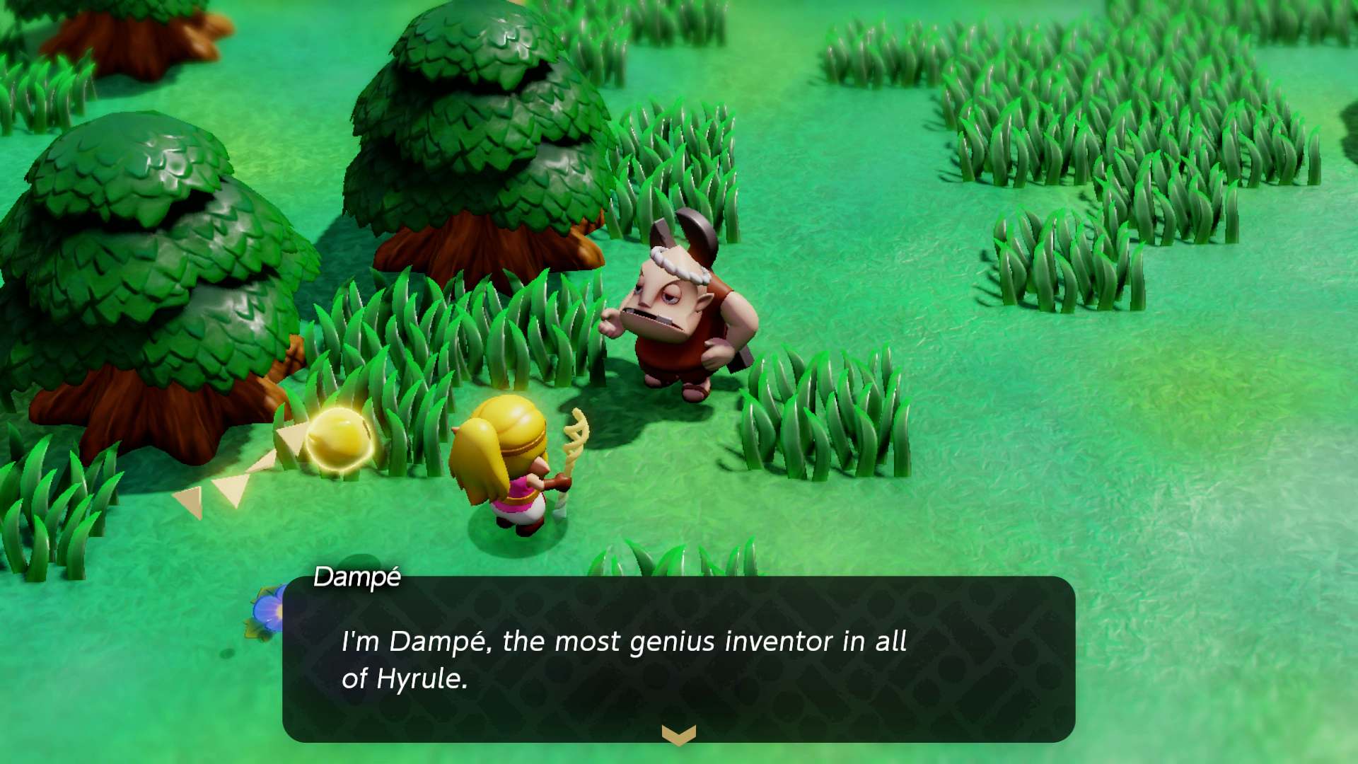 In her travels around Hyrule in Zelda: Echoes of Wisdom, Princess Zelda meets the enigmatic inventor, Dampe, and saves him from being attacked by crows.