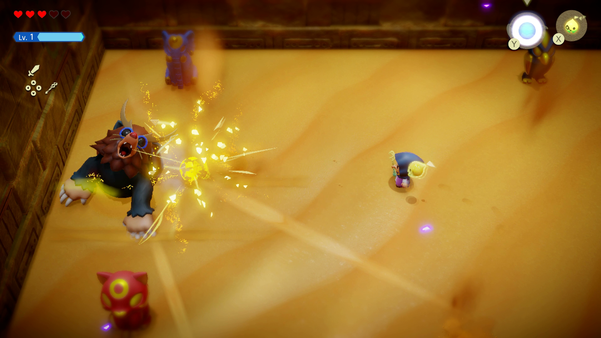Then, once you inevitably run out of charge, you need to go on the defensive and dodge his attacks until piles of sand are left littered around the arena. Equip your Tornando Echo to brush away the sand and reveal energy power ups to fuel your offence.